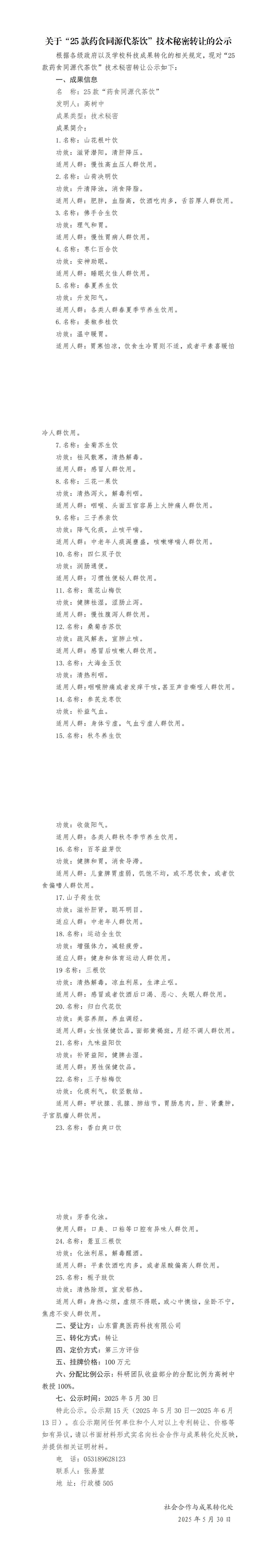 关于“25款药食同源代茶饮”技术秘密转让的公示