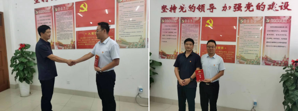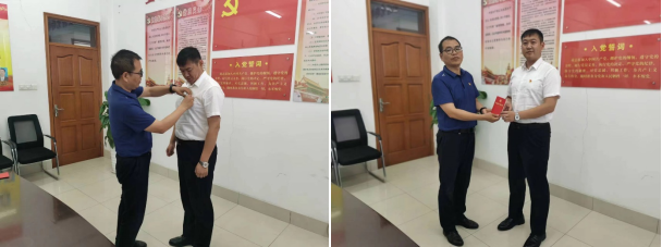 支部书记岳宝强为预备党员佩戴党徽,发放党章。希望新党员牢记入党初心,提升党性修养,听党话、感党恩、跟党走,全心全意为人民服务,并祝贺新党员加入到党的组织中来。