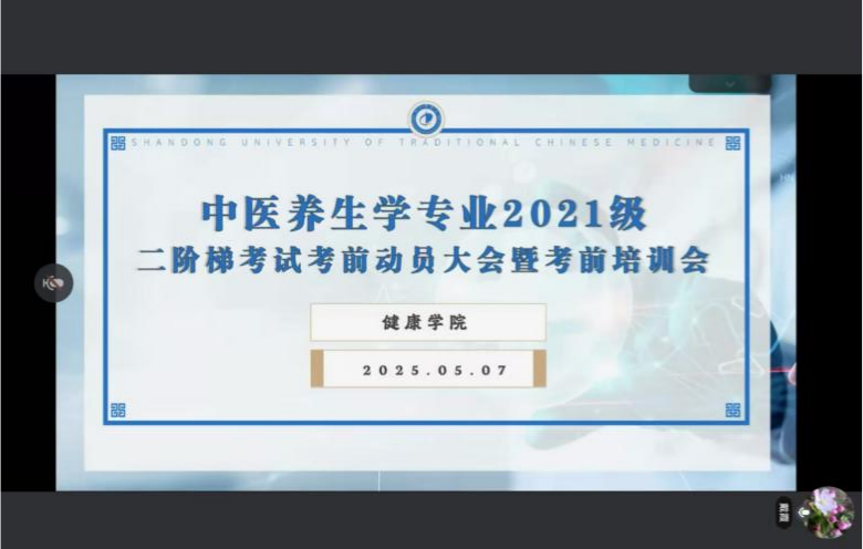 为助力2021级中医养生学专业同学更好地迎接中医师岗位胜任力第二阶梯考核,解答考试相关疑惑,健康学院于2025年05月07日成功举办了线上考前培训会。本次会议由中医养生学专业负责人戴霞教授主持,中医养生学专业2020级优秀学长张欣怡、王可欣、王吉祥介绍经验,中医养生学2021级全体同学共同参与。