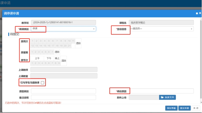 停课:选择变动信息、原周次、原星期、原节次、已与学生沟通换课、调动原因,提交申请。