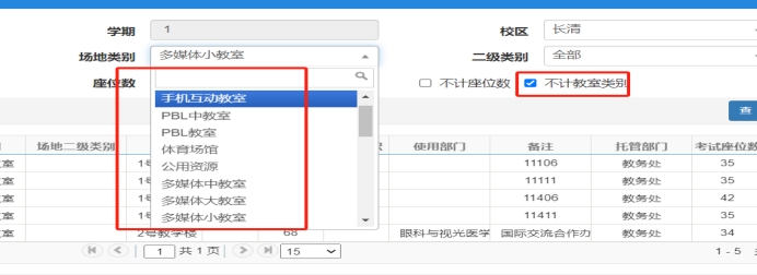 换教室:选择变动信息、替换教室(勾选不计教室类别可选择不同类型的空余教室)