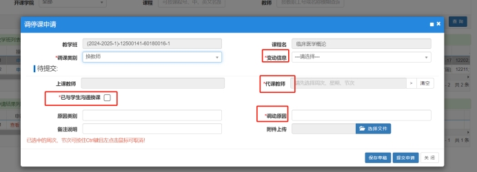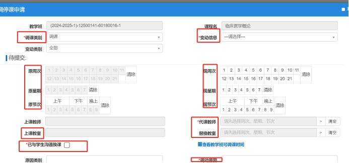 调课:选择变动信息、原周次、原星期、原节次、现周次、现星期、现节次、代课教师、替换教室、已与学生沟通换课、调动原因,提交申请。