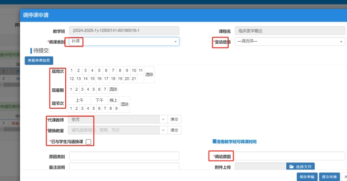 补课:选择变动信息、现周次、现星期、现节次、替换教室、已与学生沟通换课、调动原因,提交申请。