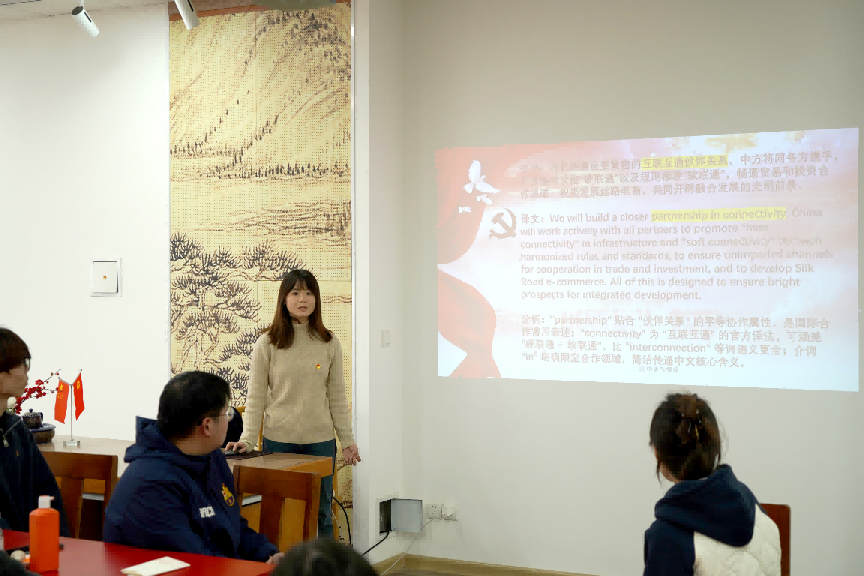 理论交流环节内容丰富。山师外院赵文誉同学带来双语微党课,聚焦《习近平谈治国理政》第四卷中“互联互通伙伴关系”等核心概念的英译解析,通过对比研究探讨了如何准确传达政治术语的内涵。宋砚冰同学则进行了《中外文学作品共产党员形象比较》的分享,以《人的境遇》与《青春之歌》为例,从跨文化视角探讨了不同作品中共产党员形象的塑造。