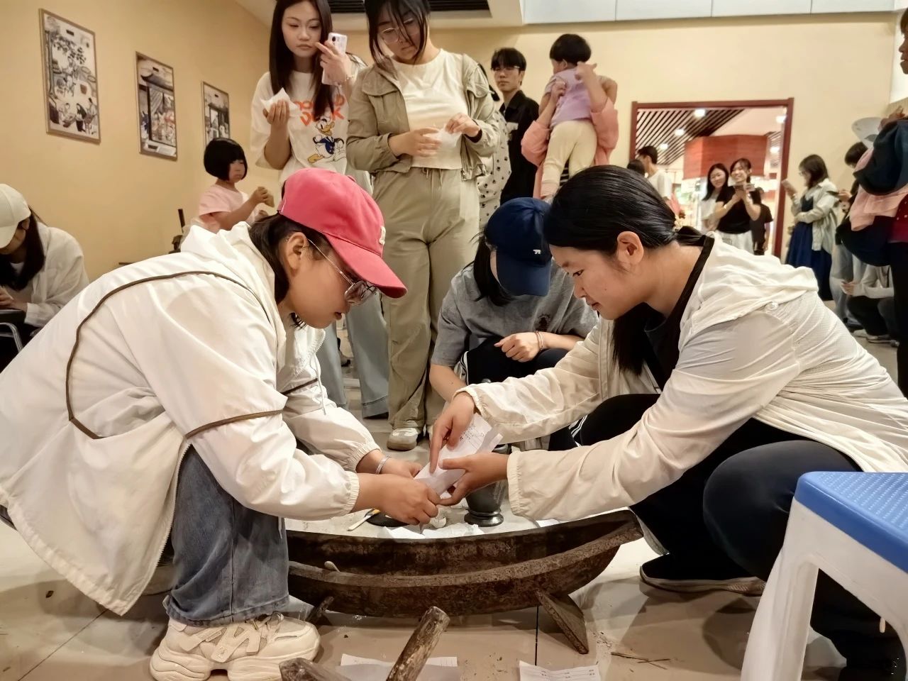 互动体验区气氛热烈,市民凭集赞凭证有序参与漆扇制作、石刻拓印、扎染制作、香囊缝制等传统技艺项目。据统计,活动期间共完成漆扇作品400把、拓印作品120幅、香囊300余个,几位初中生兴奋地展示着刚完成的石刻拓印:“没想到历史课本上的文字真的能拓下来!感觉太神奇了!”