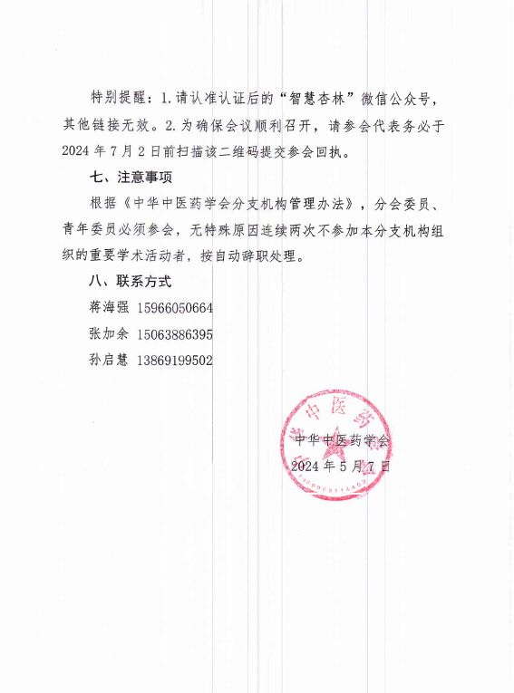特别提醒:1.请认准认证后的“智慧杏林”微信公众号,其他链接无效。2.为确保会议顺利召开,请参会代表务必于2024年7月2日前扫描该二维码提交参会回执。