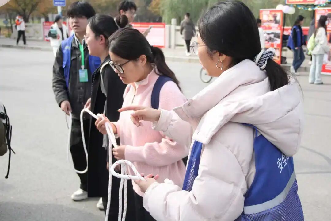 • 消防绳结“速学赛”最考验手速,2分钟内学会双套结或单结,有人练了两次就熟练上手,直呼“原来紧急时绑绳子这么有用”。