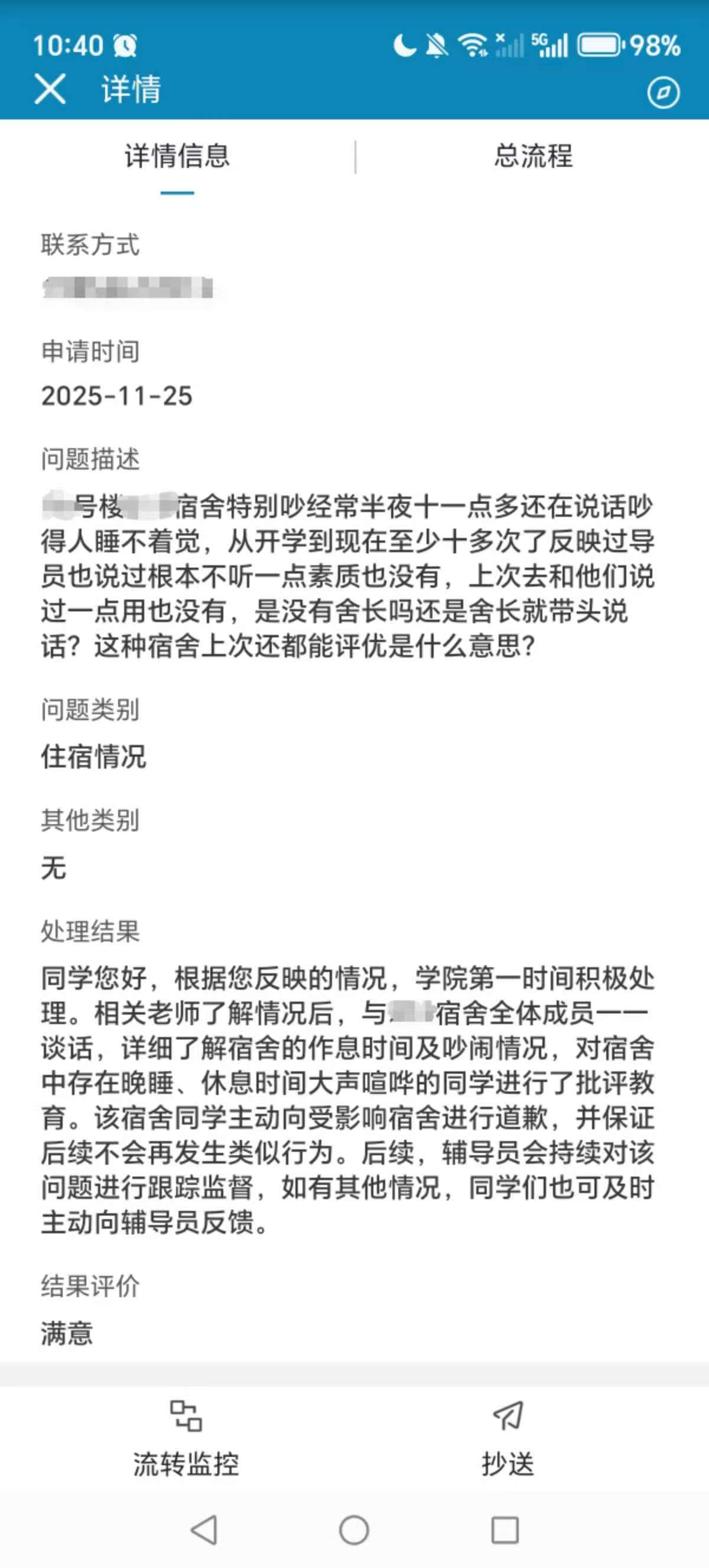 部门回复:物业相关涉事人员已于11月底辞退。物业管理人员已对学生公寓员工紧急开会,并着重强调与师生沟通态度等相关事宜。下一步,物业将重点加强服务意识与沟通技巧的培训,确保每一位工作人员都能以热情、专业的态度为大家服务!