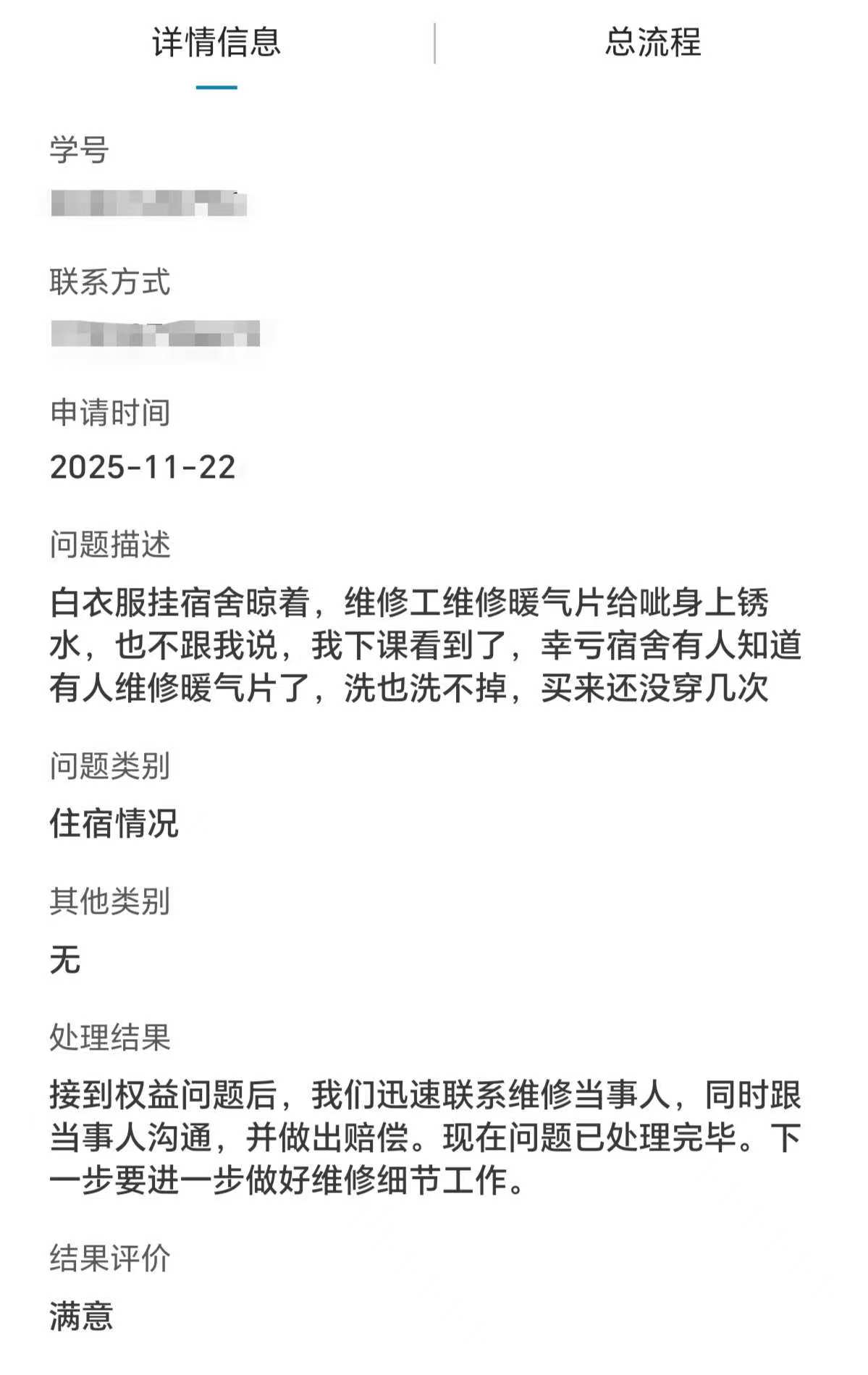 2.学生意见:暖气片维修时,白衣服被锈水弄脏,洗不掉。