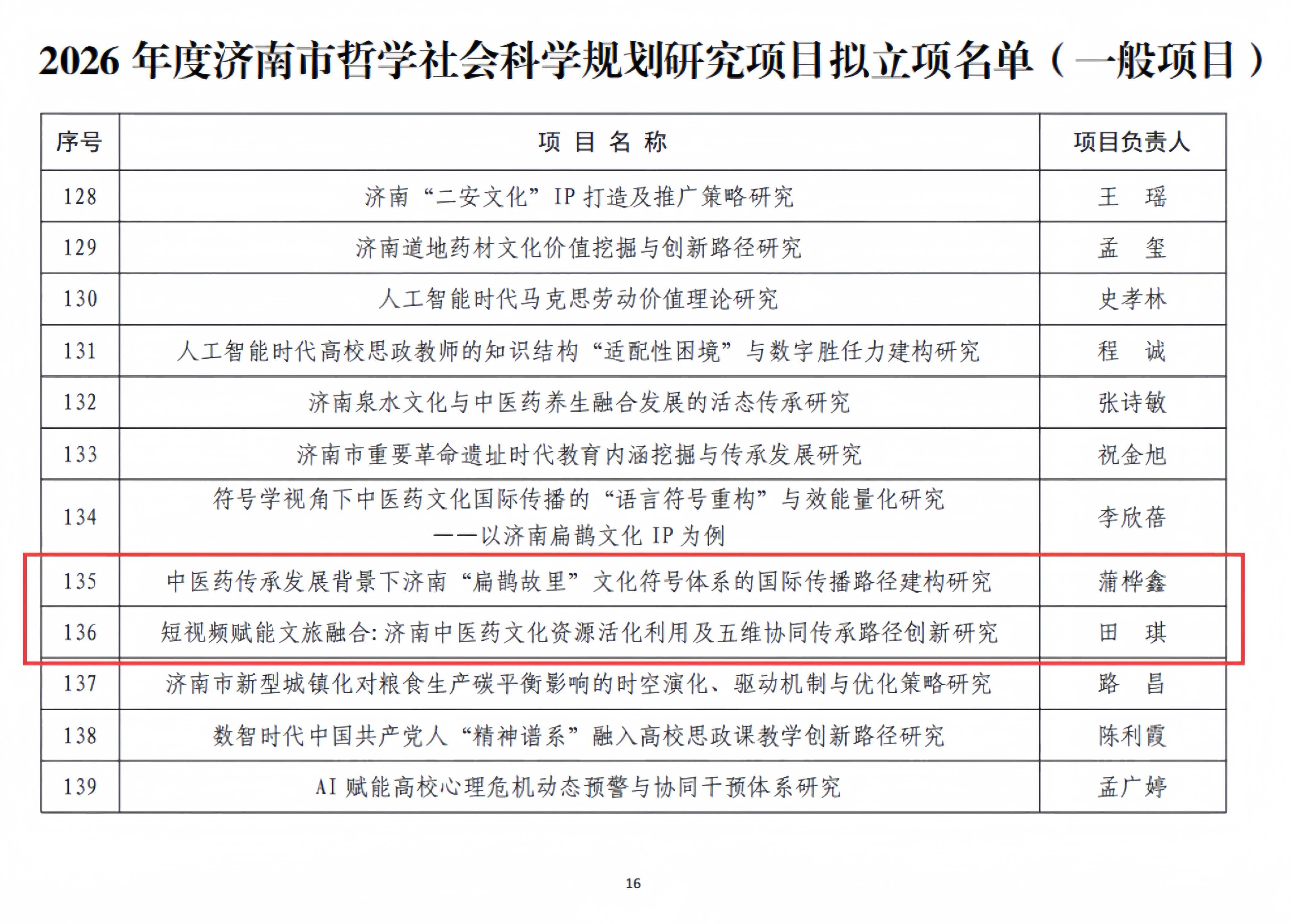 近日,济南市哲学社会科学工作办公室公布了2026年度济南市哲学社会科学规划研究项目拟立项名单。我院蒲桦鑫申报的《中医药传承发展背景下济南“扁鹊故里”文化符号体系的国际传播路径构建研究》、田琪申报的《短视频赋能文旅融合:济南中医药文化资源活化利用及五维协同传承路径创新研究》两项课题成功获批立项。