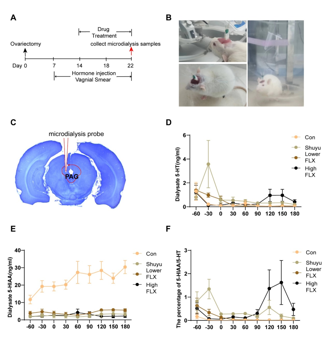 在上述基础上,研究人员利用微透析技术,实时监测各组动物PAG脑区细胞外5-HT及其代谢产物含量,发现舒郁胶囊干预对5-HT浓度几乎无影响,排除了5-HT系统参与舒郁胶囊药效发挥(图3)。