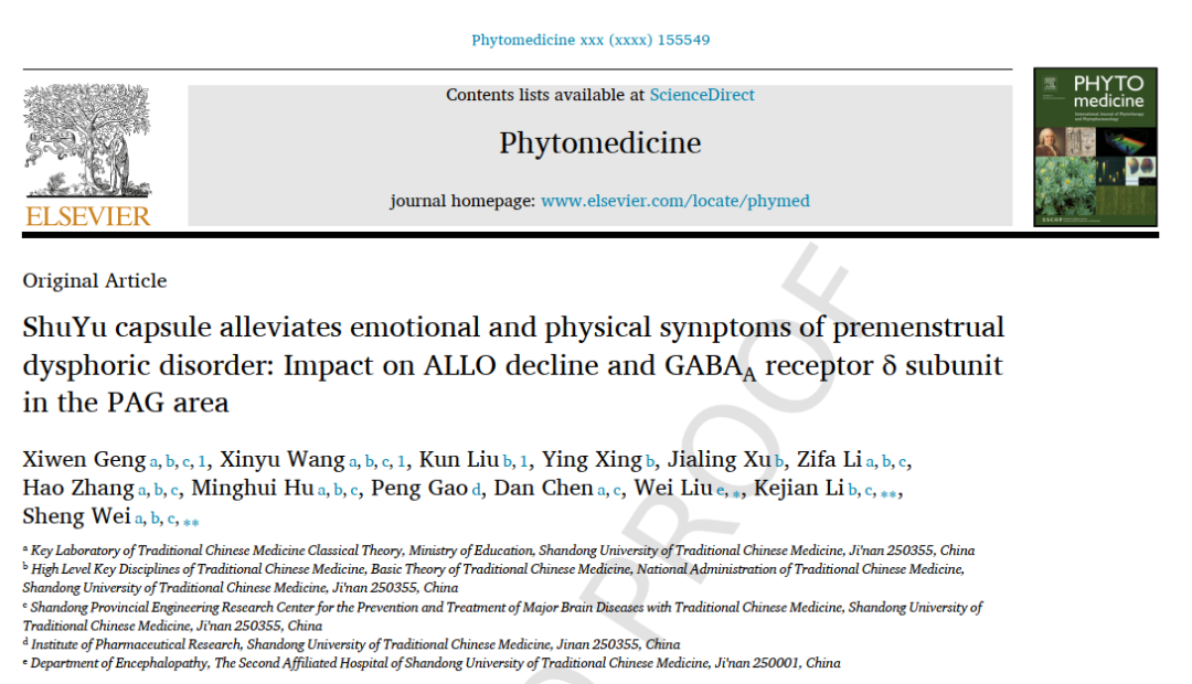 2024年3月19日,taptap点点体育官网下载app魏盛团队合作在Phytomedicine上在线发表了题为“ShuYu Capsule Alleviates Emotional and Physical Symptoms of Premenstrual Dysphoric Disorder: Impact on ALLO Decline and GABAA Receptor δ Subunit in the PAG Area”的研究成果。该团队综合应用动物行为、神经电生理、脑内微透析及分子生物学等手段发现舒郁胶囊干预后中枢PAG脑区的神经生化、动物行为、神经元活性及GABAA受体亚基表达的变化。