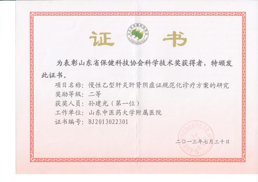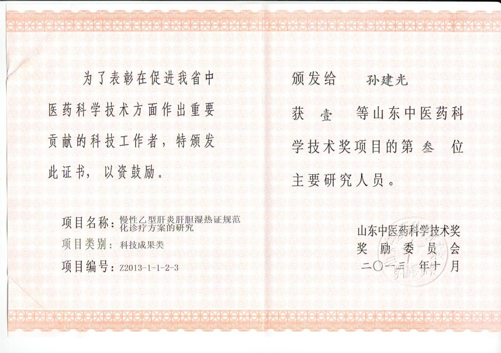 孙建光(1970—),男,山东威海文登人。医学博士,教授,主任医师,博士生导师。现任taptap点点体育官网下载app附属医院肝病科主任、国家中医药管理局重点学科中医肝胆病学学科带头人、全国第四批优秀中医临床人才、全国第四批老中医药专家学术经验继承人、山东省高层次优秀中医临床人才。兼任山东中医药学会肝病专业委员会主任委员、中国中药协会肝病药物研究专业委员会副主任委员、中国中医药研究促进会肝胆病分会副主任委员、中国民族医药学会医养结合分会副会长、中华中医药学会肝胆病分会常务委员、中国医师协会中西医结合分会肝病专家委员会常务委员、中国中西医结合学会肝病专业委员会委员、中华中医药学会感染病分会常务委。曾获“山东省卫生系统青年岗位能手”、“山东省优秀青年知识分子”、“山东省医师协会国医杰出精英奖”等荣誉称号。