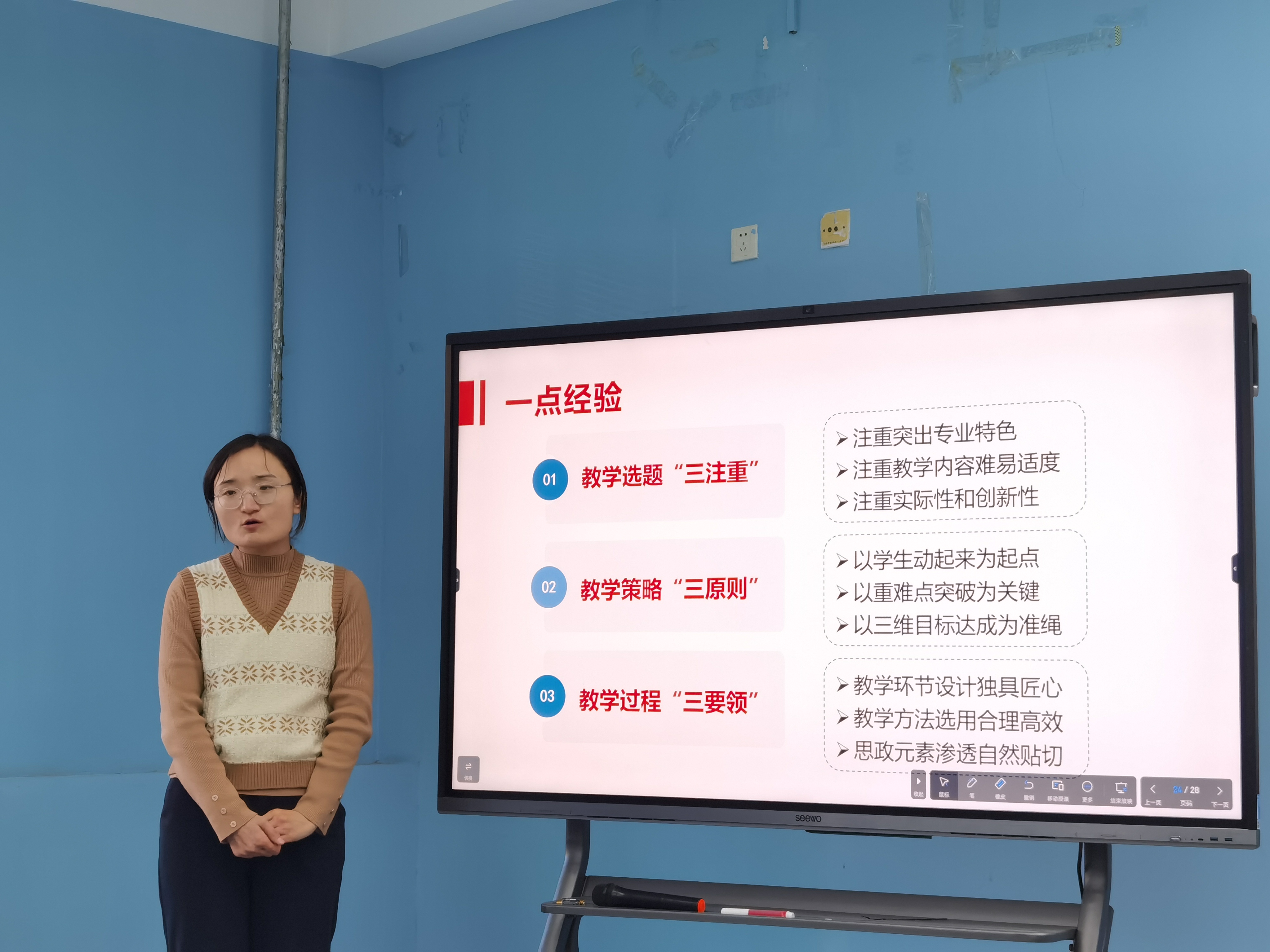 接下来,团队于鹰、冯伟科、王彦芳、孔畅、乔远静五位老师分别进行了主题发言。于鹰老师结合自己三次参加教创赛的体会,分别从大赛概况、网络评审、现场评审等几个方面详细介绍了教创赛的参赛要求和评价标准,认真解读了大赛的指标内涵,同时总结出了“创新是王道,学习是正道,合作是要道”的参赛心得,在场团队老师们深受启发。于鹰老师作为主讲教师获得2023年山东省高校教师教学创新大赛课程思政副高组二等奖,作为团队主要成员获得首届山东省高校教师教学创新大赛正高组一等奖,在教创赛中积累了丰富的经验。