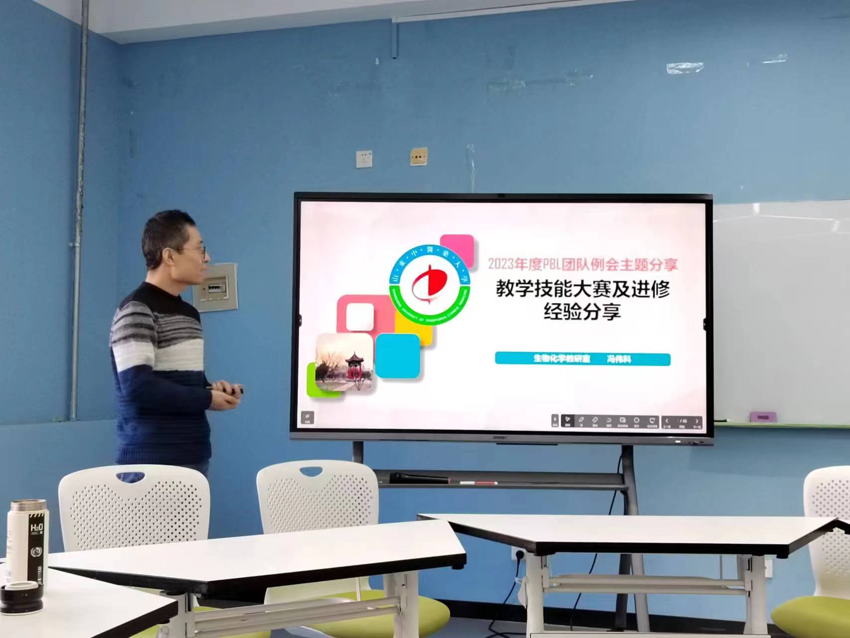 接下来,冯伟科老师针对学校教学技能大赛的比赛情况进行了简单介绍,并着重围绕在北京大学医学院进修的收获展开分享,特别介绍了北医在PBL的课程体系、课程内容、教学组织、考核评价等方面的成功经验,提出了很多新颖的教改措施,令在场的老师们耳目一新、豁然开朗。冯伟科老师获得2023年学校教学技能大赛医学高级组二等奖。冯老师在2019年赴北京大学医学院进修,在PBL教改方面颇有收获。