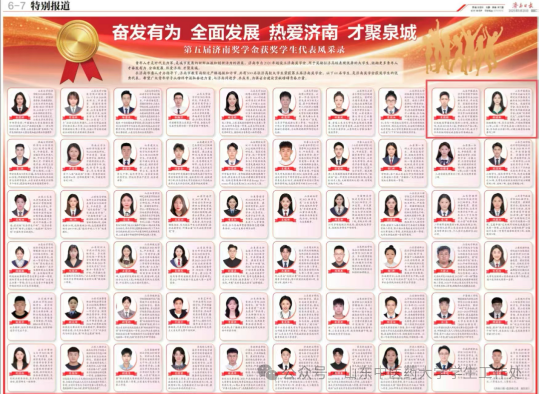 2025年5月20日,《济南日报》刊登《第五届济南奖学金获奖学生代表风采录》,我校中医文献与文化研究院2022级博士研究生张诗敏、中医学院中西医临床医学专业2020级本科生孟佳棋荣登榜单,展现了新时代中医药学子的优秀风采。